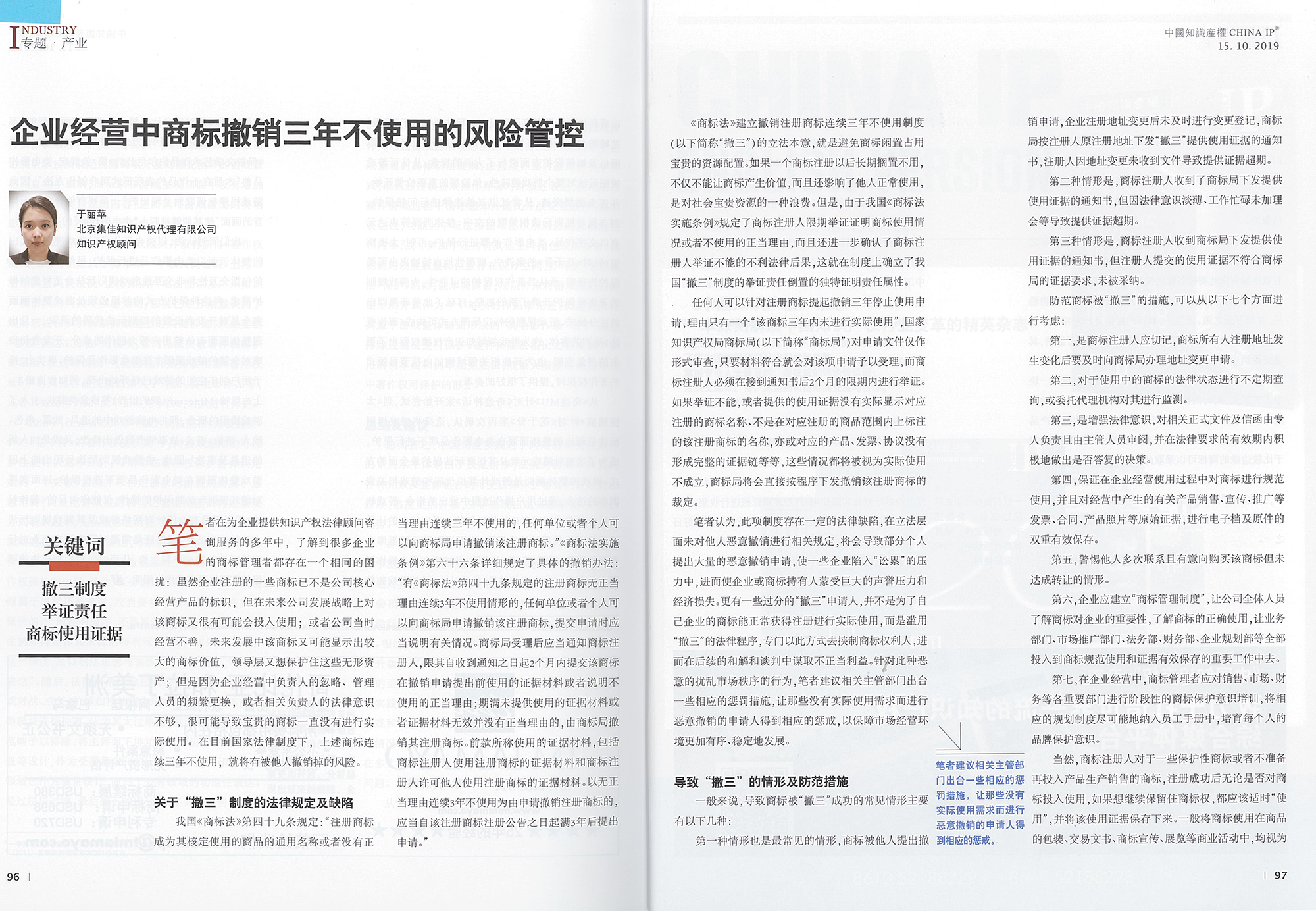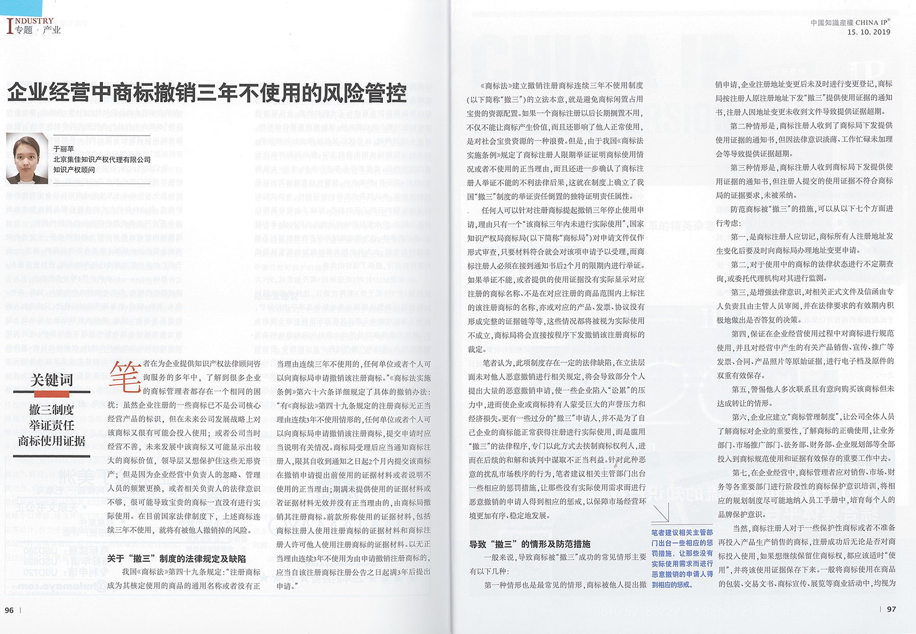 集佳文章《企業(yè)經(jīng)營中商標(biāo)撤銷三年不使用的風(fēng)險管控》在《中國知識產(chǎn)權(quán)》 發(fā)表