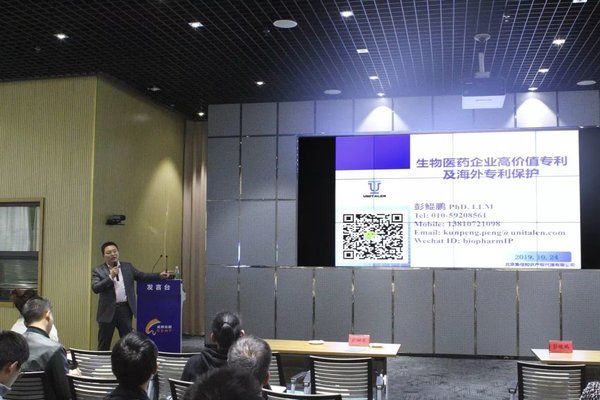 集佳合伙人、專利代理師、中華全國專利代理人協會職業培訓師彭鯤鵬博士為參會企業作“生物醫藥企業高價值專利及海外專利”主題培訓。彭鯤鵬博士對各國專利局在生物醫藥領域的實踐有深入了解,并在涉外專利申請方面擁有豐富經驗。他從美國創新藥的專利懸崖熱點問題切入引起參會人員共鳴,并對中國創新和仿制藥制度到藥品審評審批制度改革進行介紹,同時圍繞藥品專利挑戰(專利跟蹤預警、分析、應對策略)、專利保護的新思路、高價值專利保護、海外專利保護策略等方面逐一展開,針對企業目前比較關注的FTO侵權風險分析、可專利性分析等進行深刻解讀,就生物醫藥行業的典型案例進行了精彩的解析。