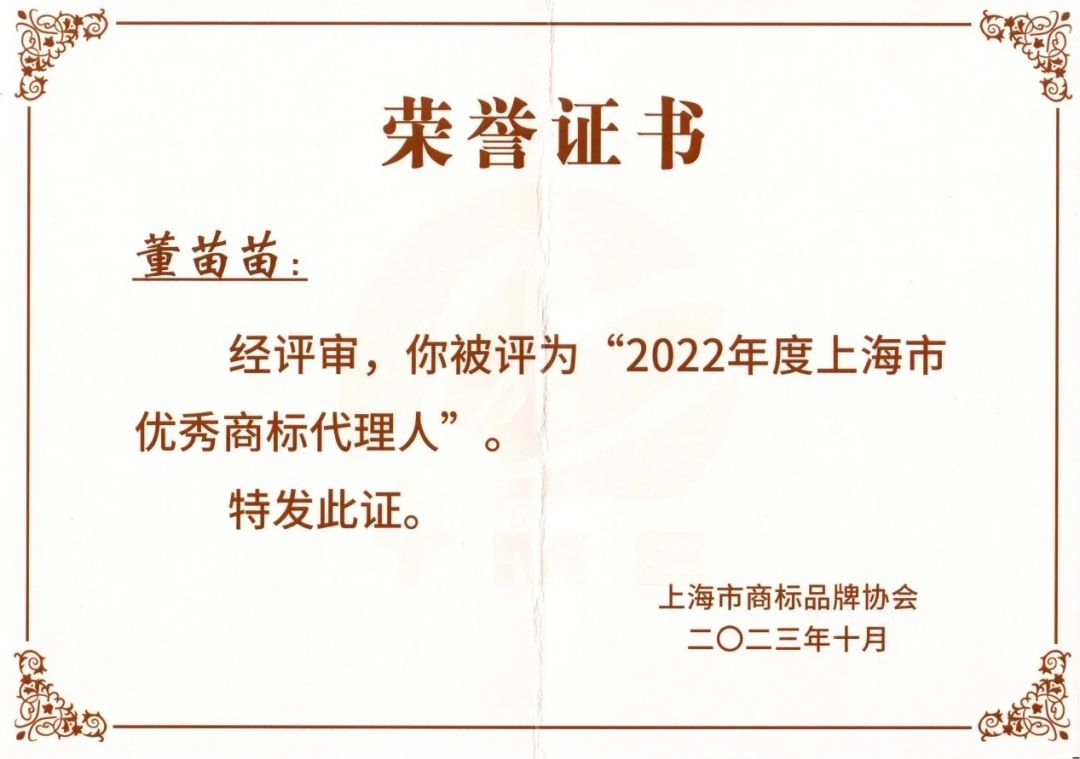 集佳上海分所董苗苗律師被評為2022年度“上海市優秀商標代理人”。