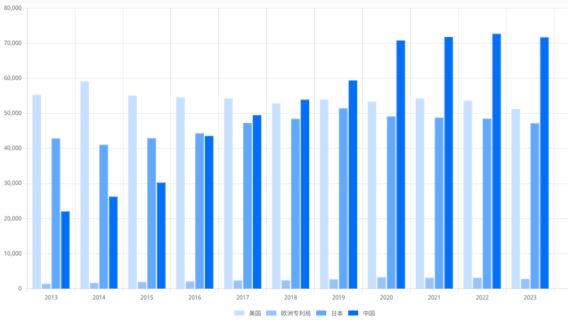 圖1 中美日歐PCT國際階段受理趨勢(2013-2023)