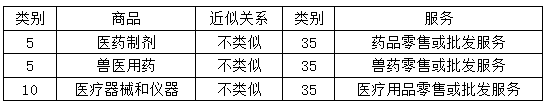 其次,在中國(guó)已經(jīng)接受的3509類似群的藥品、醫(yī)療用品零售或批發(fā)服務(wù),在與其他商品或服務(wù)的類似性判斷時(shí),根據(jù)《類似商品和服務(wù)區(qū)分表》的規(guī)定,其僅與歸屬于本類似群的服務(wù)構(gòu)成相同類似服務(wù),與該零售或批發(fā)服務(wù)所涉及的具體商品并不發(fā)生交叉檢索【4】。舉例如下:
