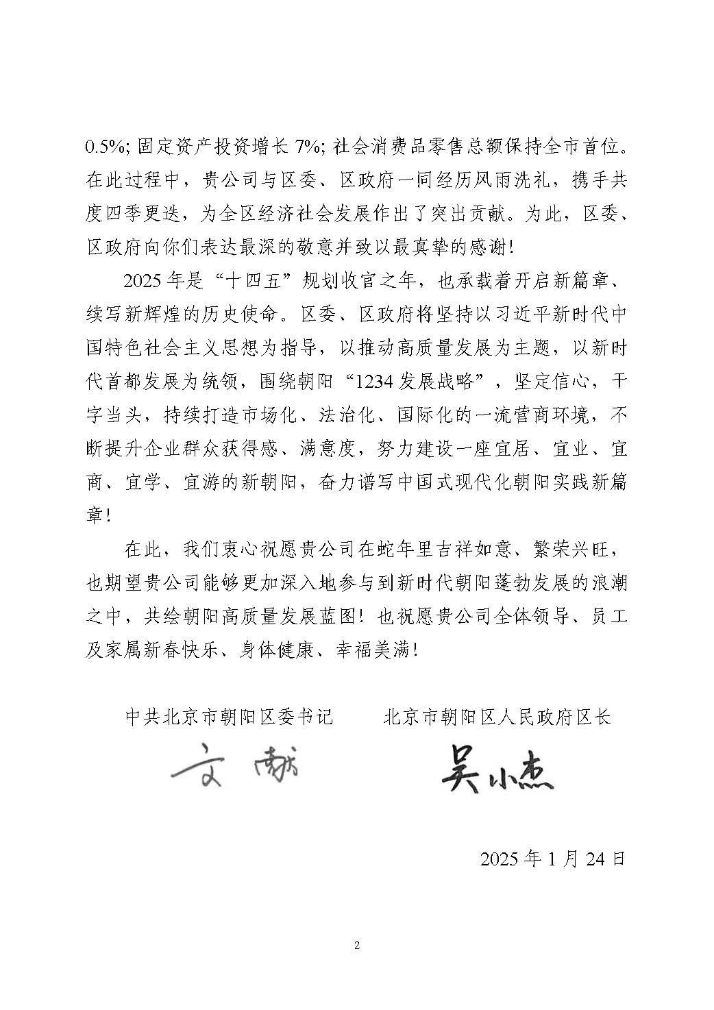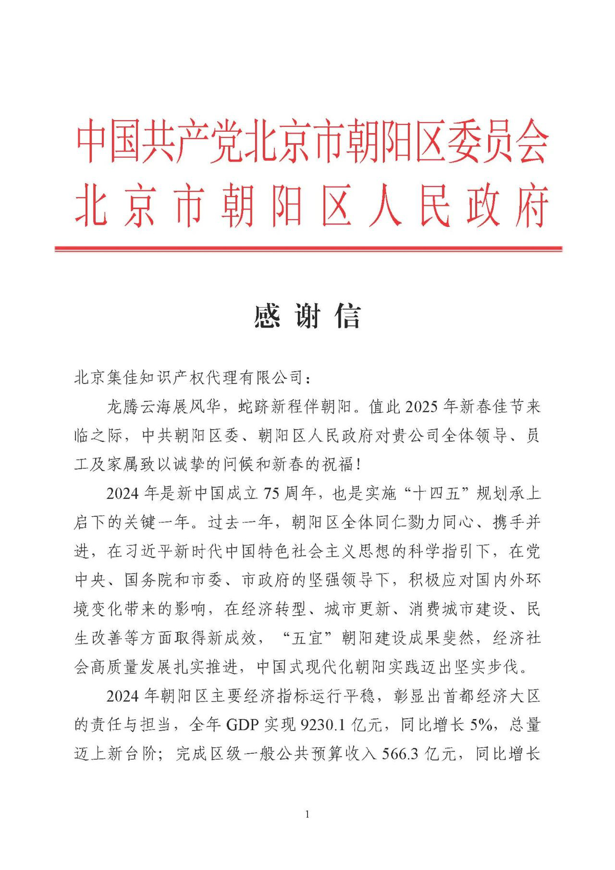 新春佳節來臨之際,集佳收到北京市朝陽區委、區政府發來的感謝信。信中,區委、區政府肯定和感謝了集佳過去一年為朝陽區經濟社會發展作出的貢獻,并對集佳全體領導、員工及家屬致以誠摯的問候和新春的祝福!