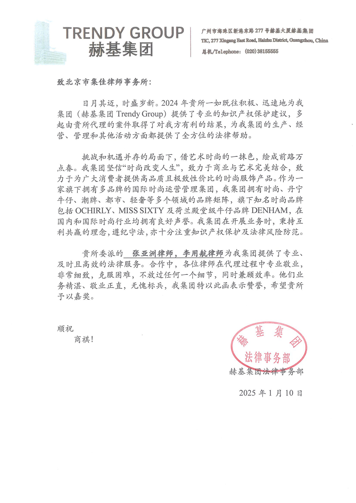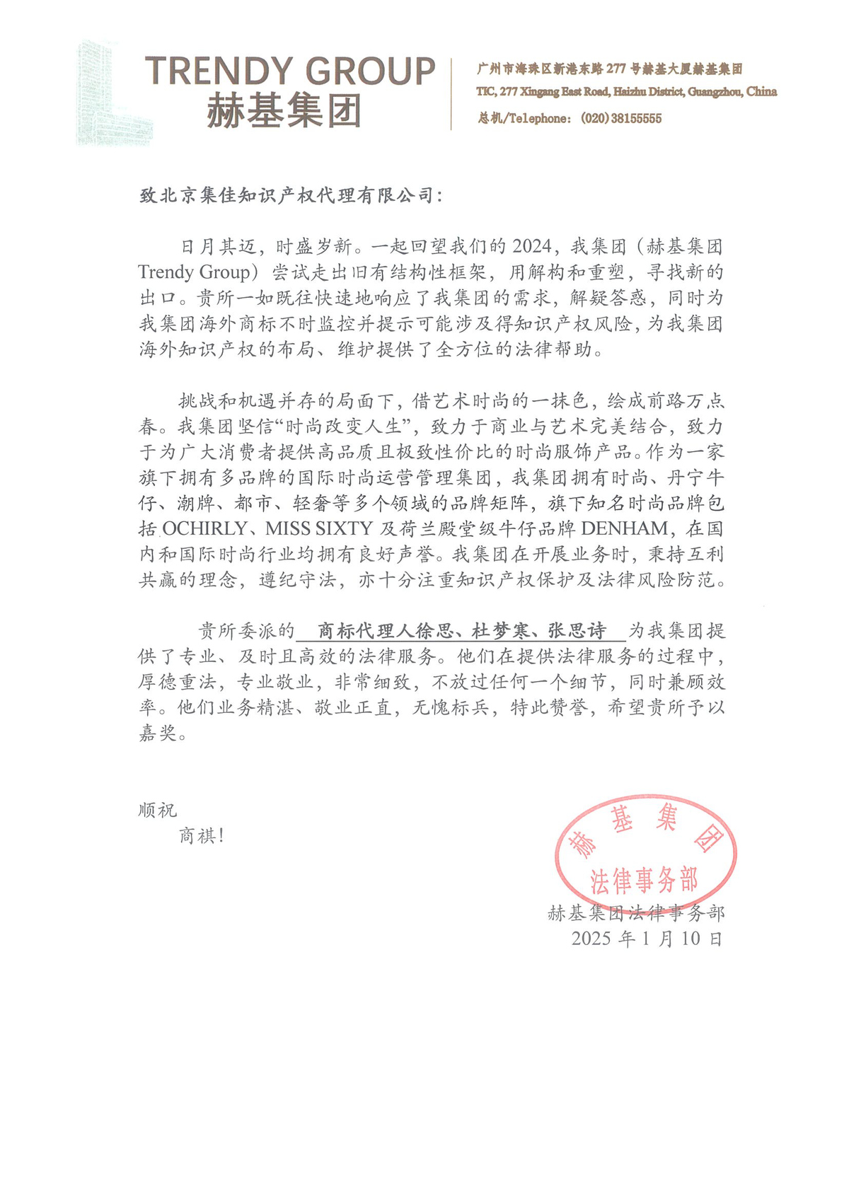 信中指出,集佳在2024年一如既往、迅速地為赫基集團提供了專業的知識產權保護建議,多起由集佳代理的案件取得了對赫基集團有利的結果,為赫基集團的生產、經營、管理和其他活動方面都提供了全方位的法律幫助。