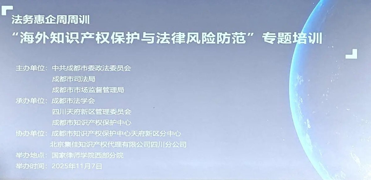 為進一步規范企業組織發展,強化成都市企業海外知識產權布局與保護意識,切實提升涉外知識產權領域的實戰應對能力,有效規避國際市場法律風險,2025年11月7日,由中共成都市委政法委員會、成都市司法局、成都市市場監督管理局主辦,成都市法學會、四川天府新區管理委員會、成都市知識產權保護中心承辦,成都市知識產權保護中心天府新區分中心、 北京集佳知識產權代理有限公司四川分公司協辦的“海外知識產權保護與法律風險防范”專題培訓順利舉辦,并為國家海外知識產權糾紛應對指導成都分中心新加坡工作站北京集佳知識產權代理有限公司進行授牌。